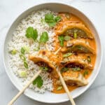 - Prepare the Curry Broth: In a large baking dish measuring about 12 x 8 inches (30 x 20 cm), combine the coconut milk, red curry paste, low sodium soy sauce, rice vinegar, honey (or sugar), and sesame oil. Whisk thoroughly until the curry paste is fully dissolved and no lumps remain. Then grate in the fresh garlic and ginger, mixing again to incorporate fully. Optional: if serving with rice or noodles and preferring a brothier consistency, add ¼ cup of water to the mixture.