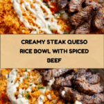 Keywords: steak quesо rice, cheesy steak rice bowl, creamy queso sauce recipe, one pan steak dinner, easy Mexican rice bowl, loaded rice bowl, dinner ideas with steak