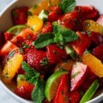 A refreshing and vibrant Strawberry Watermelon Salad combining juicy watermelon cubes and fresh strawberries, enhanced with zesty lime juice, sweet honey, and fragrant mint leaves. Perfect as a light, healthy snack or a colorful side dish, with optional add-ins like feta cheese, cucumber, or chili flakes to customize the flavor.