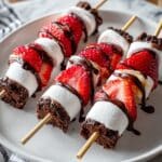 Sweet Strawberry Brownie Kabobs combine fudgy brownie squares, fresh strawberries, and fluffy marshmallows threaded onto skewers and topped with melted semi-sweet chocolate, making an effortless and fun party treat that’s both visually appealing and delicious.