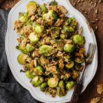 These Tahini-Caesar Roasted Brussels Sprouts combine the nutty richness of tahini with classic Caesar flavors like anchovies and Parmesan, roasted to a perfect golden-brown crisp. Topped with crunchy homemade whole-wheat breadcrumbs and roasted sunflower seeds, this dish is a vibrant, flavorful side perfect for any meal.