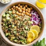 The Jennifer Aniston Salad is a vibrant and refreshing quinoa and chickpea salad featuring a zesty lemon dressing, fresh herbs, crunchy pistachios, and creamy feta. This nutritious Mediterranean-inspired dish combines bright citrus flavors with wholesome ingredients, making it a perfect light lunch or side dish that can be prepared ahead of time.