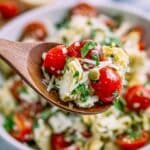 - Combine Salad Ingredients: In a large serving bowl, add the halved cherry or grape tomatoes, quartered artichoke hearts, chopped capers, thinly sliced green onions, and chopped fresh herbs of your choice (parsley, basil, and/or cilantro).