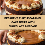 This indulgent Turtle Caramel Cake combines the rich flavors of German chocolate cake with gooey caramel, crunchy pecans, and smooth chocolate fudge frosting, creating a decadent dessert perfect for any special occasion or chocolate lover’s treat.