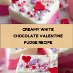 This White Chocolate Valentine Fudge is a sweet and creamy treat perfect for celebrating love and friendship. Its beautiful pink layer and festive sprinkles make it as delightful to look at as it is to eat. Easy to make, it’s a great homemade gift or a delicious dessert for Valentine’s Day.