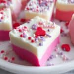 This White Chocolate Valentine Fudge is a sweet and creamy treat perfect for celebrating love and friendship. Its beautiful pink layer and festive sprinkles make it as delightful to look at as it is to eat. Easy to make, it’s a great homemade gift or a delicious dessert for Valentine’s Day.