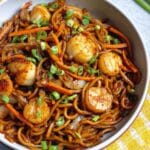 - Finish and serve: Turn off the heat and sprinkle the chopped green parts of the spring onions on top for freshness. Transfer to a serving plate and enjoy your delicious Yaki Udon with Shrimp!